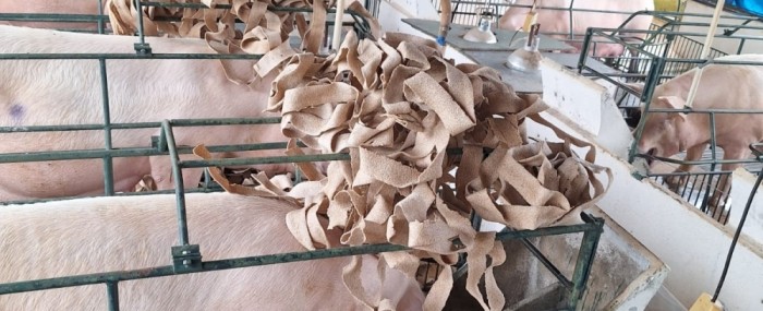The product resembles branches; it is made of long, flexible filaments that can be pulled, bitten, and manipulated by the females during the pre-farrowing period. “When we offer the material to the sow, she manifests the instinct that’s there, ready to be expressed,” Monteiro says.
